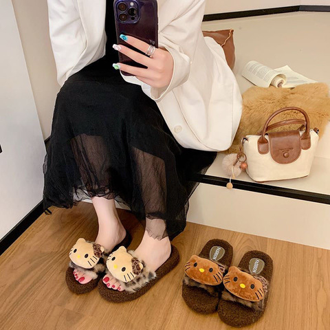 2025秋冬豹纹卡通一字懒人棉拖鞋毛毛时尚ins潮可爱KT猫动物女鞋