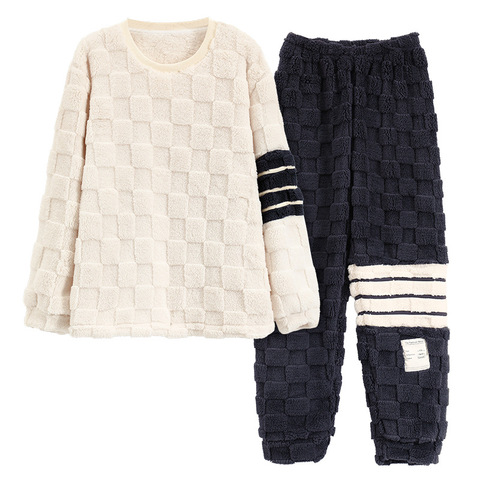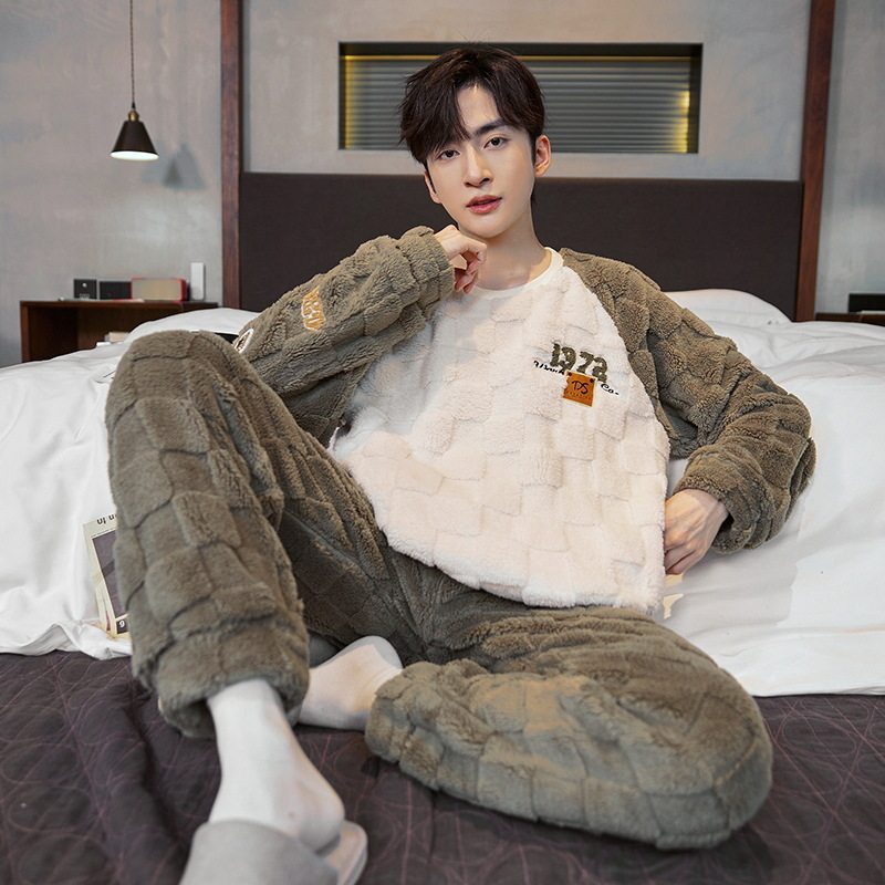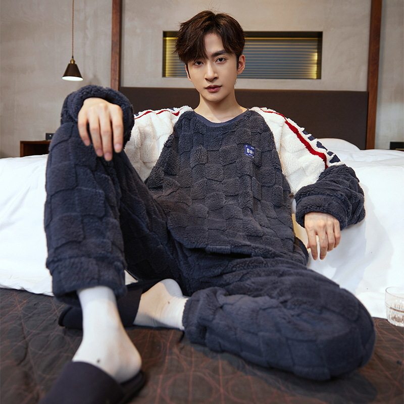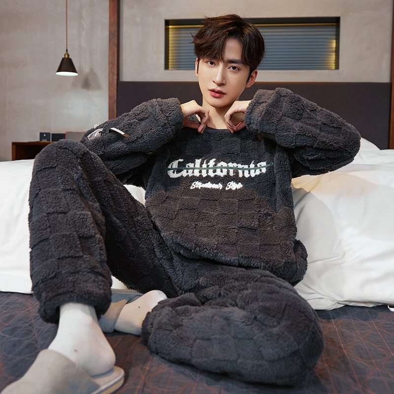 法兰绒睡衣男冬季加厚加绒珊瑚绒长袖男士青少年高级感家居服套装