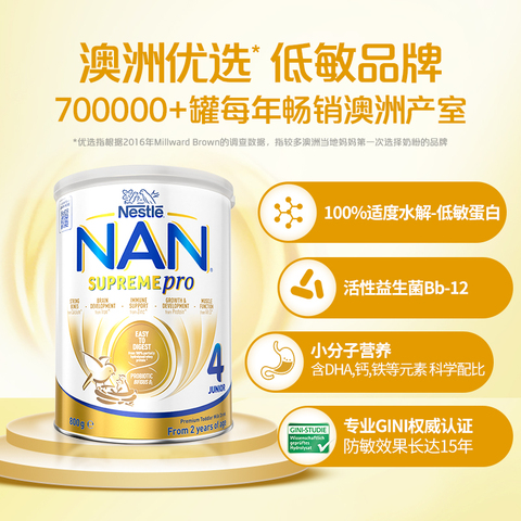 单笔买满6罐送摩托滑行车/儿童相机/60元购物金(3选1)!雀巢澳洲版超级能恩4段适度水解奶粉800g*6罐,科学营养配比,满足营养所需促进铁的吸收,有助于视力发育,有助于改善饮食,有助于骨骼和牙齿的发育人体主要构成物质提供多种氨基酸形成红细胞必需元素
