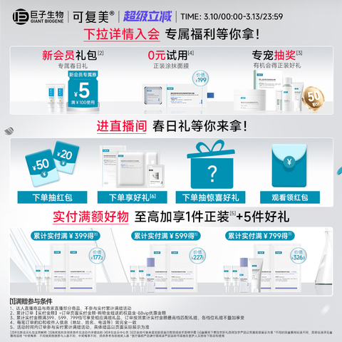 【下单立减15元,首单4元淘金币1元88vip最终到手71元】赠品:可复美胶原冻膜2颗+可复美帆布袋1个,可复美小水库补水保湿面膜!专注敏肌修护补水,水润光泽,舒缓敏感,屏障修护,紧致弹润,打造肌肤自我润湿系统,持水力UP~