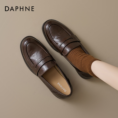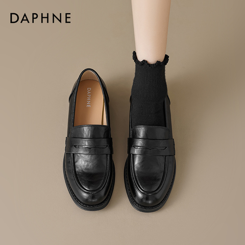 达芙妮英伦风黑色小皮鞋女春季2026新款粗中跟乐福鞋通勤工作单鞋