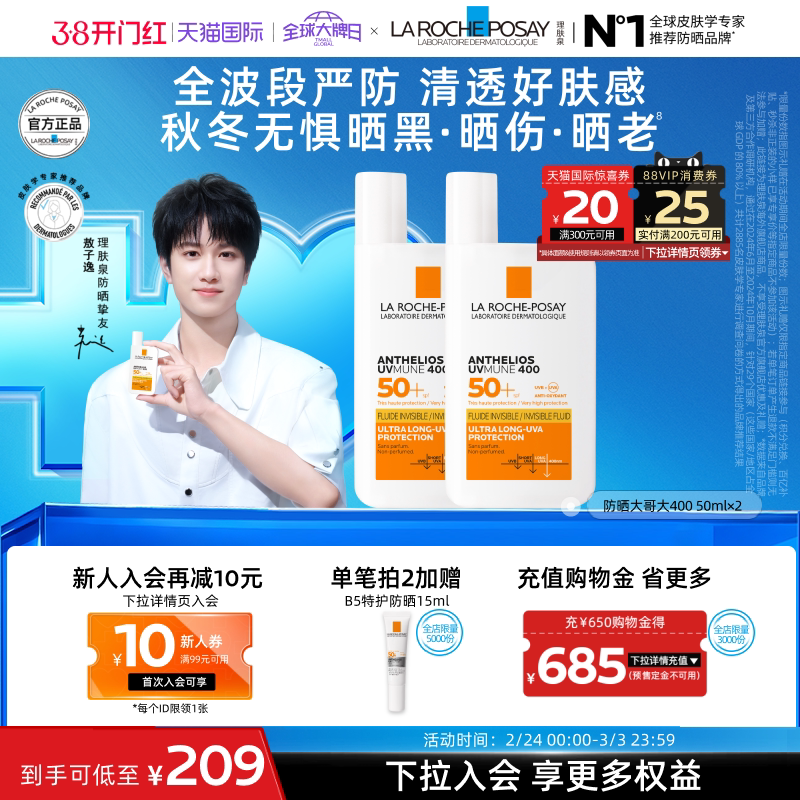 【理肤泉】大哥大防晒400 50ml*②支,88vip[\u1f4b0]153.2(4r琻币) 折76.6/支!赠B5特护防晒15ml[礼物] 防晒力、肤感都无可挑剔! 专利成膜技术,严防死守每一寸皮肤!