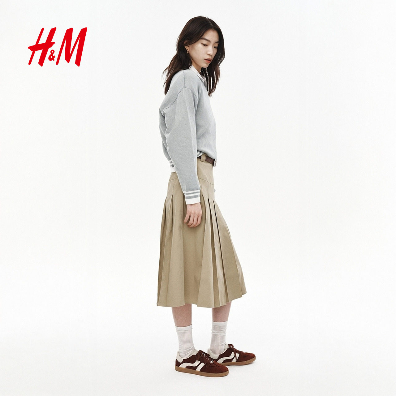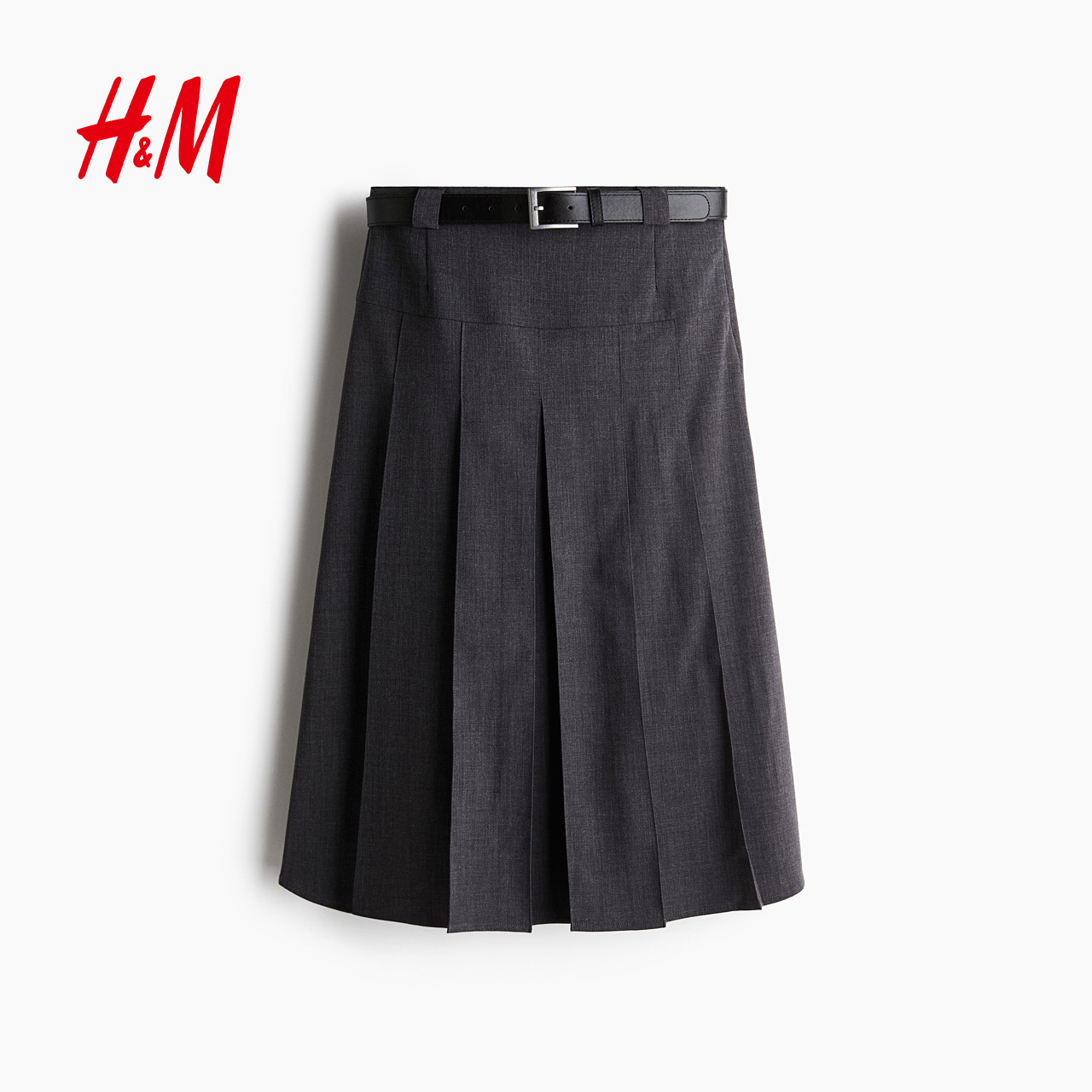 HM女装半身裙春季学院风中长款气质欧若风含腰带A字百褶裙1286177
