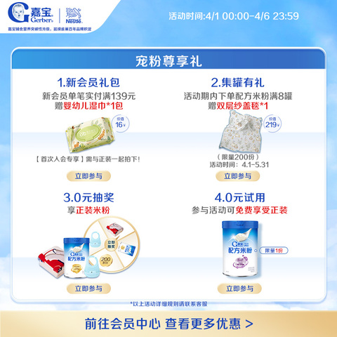 【会员买1罐赠趣味拼图(限量500份),买2罐赠悬挂乒乓球(限量300份),买4罐赠液晶画板(限量100份)】嘉宝辅食营养突破性升级,延续雀巢百年品牌积淀!首·个配方米粉系列,肚肚舒适双子星,营养亲和好吸收!嘉宝配方米粉,A2β-酪蛋白好吸收,优惠来袭!宝宝营养必备,嘉宝A2β-酪蛋白益生菌米粉,低价特惠,嘉宝A2β-酪蛋白,高铁低敏,助成长