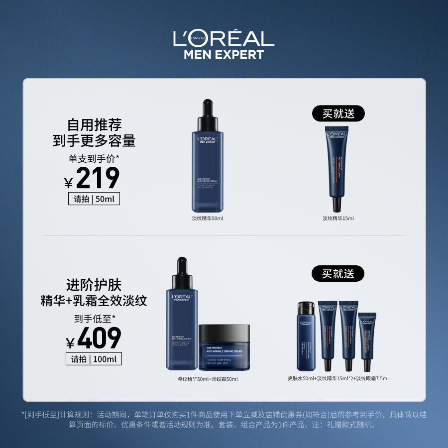 【券后209,凑单后177.37(淘金币7.47-消费券凑单)赠:淡纹精华15ml】欧莱雅男士青春肌源淡纹精华液紧致抗皱抗老,补水保湿护肤品套装