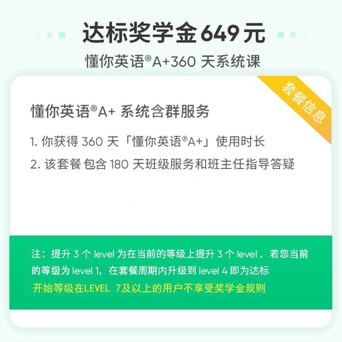 【达标奖学金649元】懂你英语A+360天成人英语puls版,自带水平测试,5分钟快速定位英语水平,量身定制系统化课程,为每个人推送对应等级的课程。10分钟搞定一个知识点,随时随地掏出手机就能学。