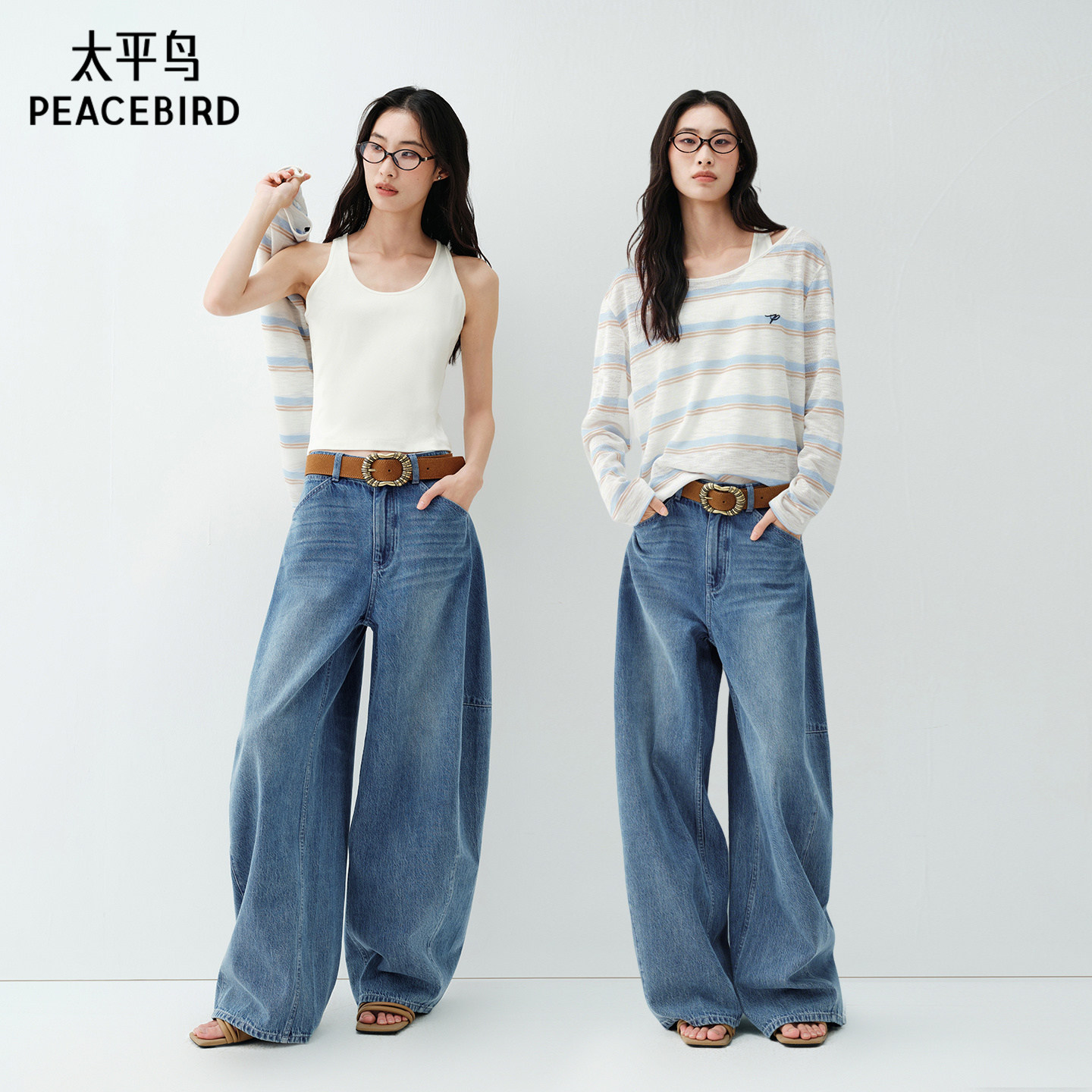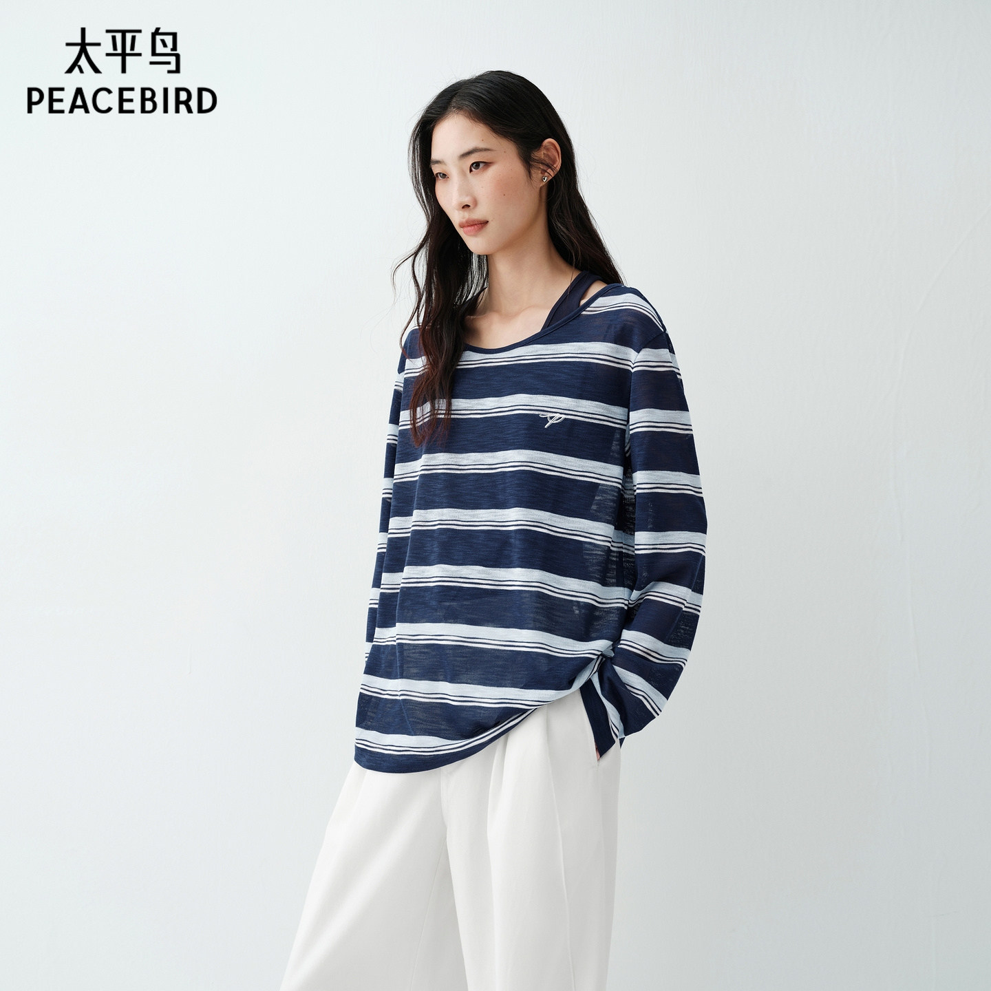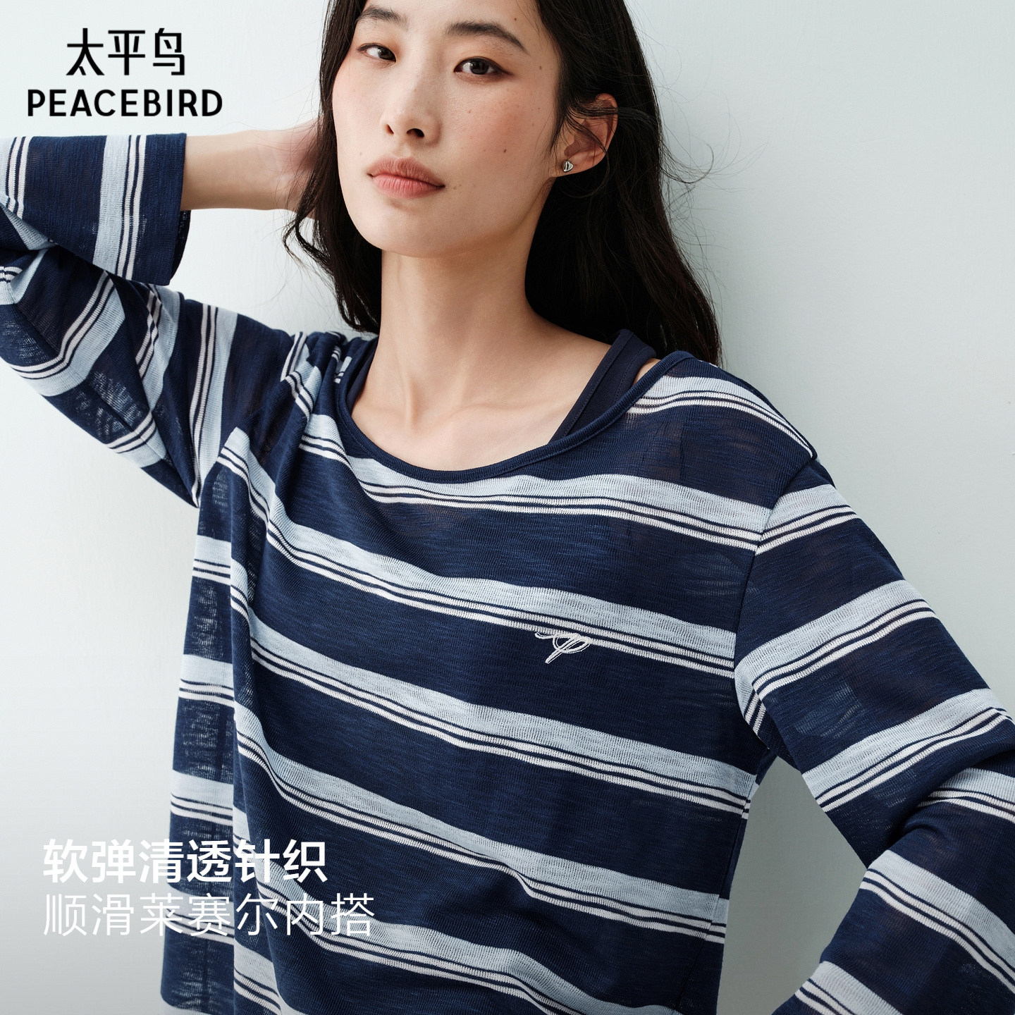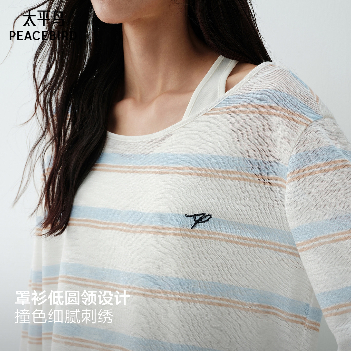太平鸟 宽松条纹罩衫26夏季新款可拆卸莱赛尔背心长袖T恤两件套