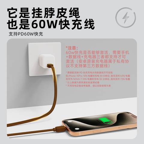 解放双手拒绝裤袋负重,手机挂脖线二合一,它是挂脖皮绳,也是60W快充线,支持PD60W快充,支持苹果15/16系列及安卓快充,加厚密缝皮革材质,扁平造型更舒适,承重力更出色,防丟防摔