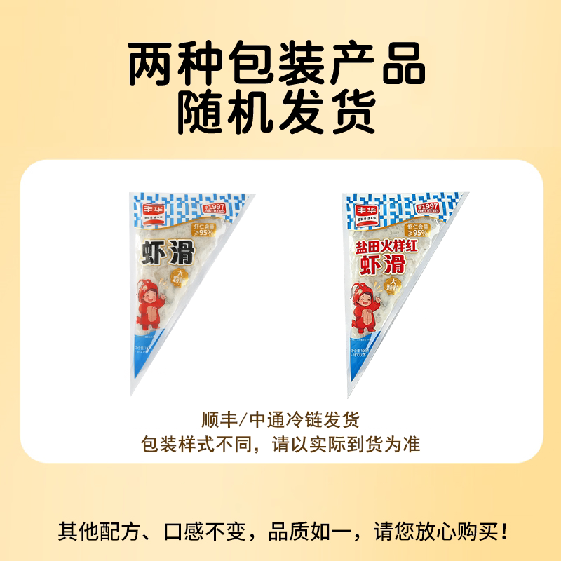 始于1997年的品牌!冷链发货全程护鲜!丰华食品旗舰店•虾滑100g*5袋29.9亓,折5.9亓/袋虾仁含量≥95%,实打实的虾肉 火锅店半份要36煮火锅、做虾滑汤、煎虾饼等 大小朋友都爱吃