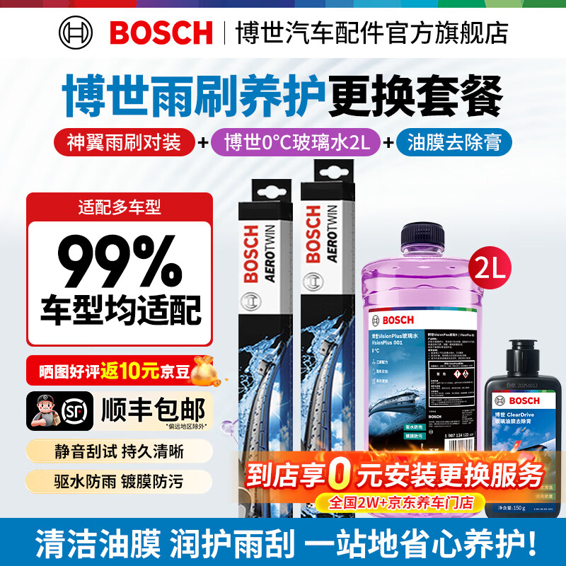 博世(BOSCH)汽车无骨雨刷器雨刮片胶条养护套餐 适配99%车型 【进口胶条】神翼雨刮一对+雨刮水+去油膜膏 *下单备注车型+年款或车架号*