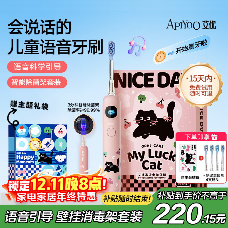 ApiYoo艾优A9pro儿童电动牙刷消毒架套装智能语音提醒软毛 适用3-15岁学生男女小孩生日儿童圣诞礼物国补