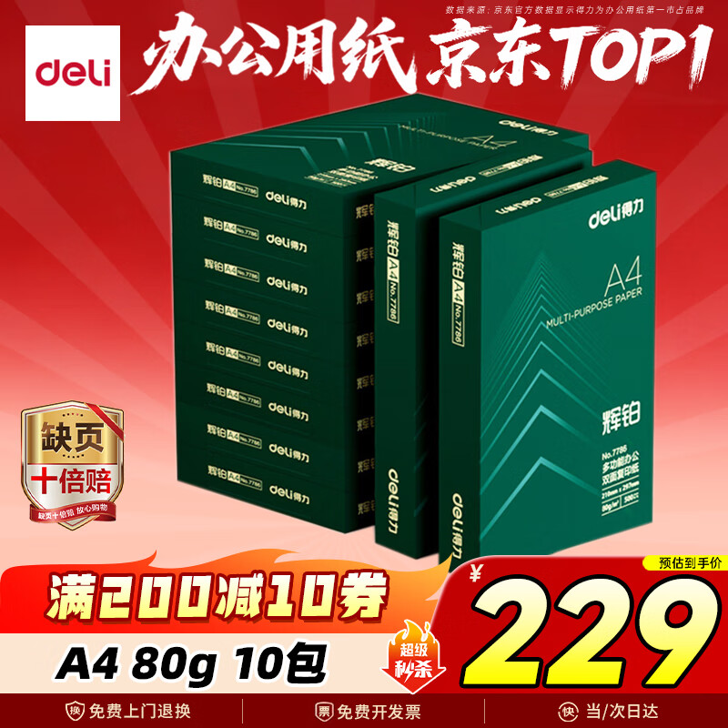 得力(deli)辉铂A4打印纸 80g500张*10包一箱 双面加厚 顺滑打印复印纸 整箱5000张 7799【品质升级】