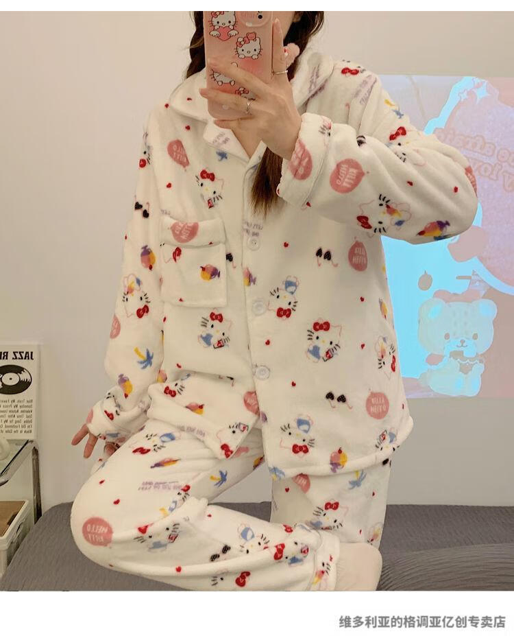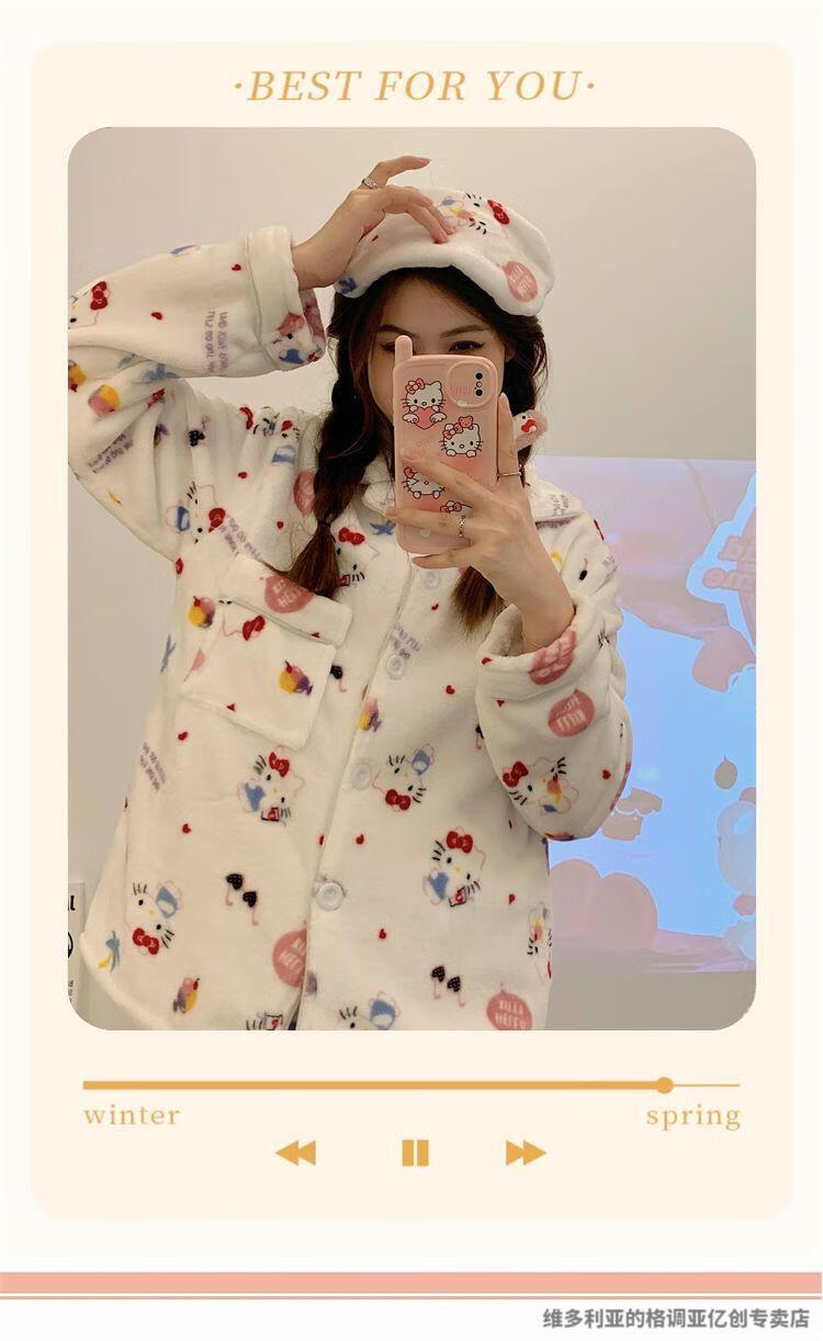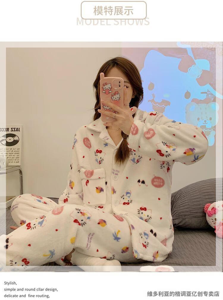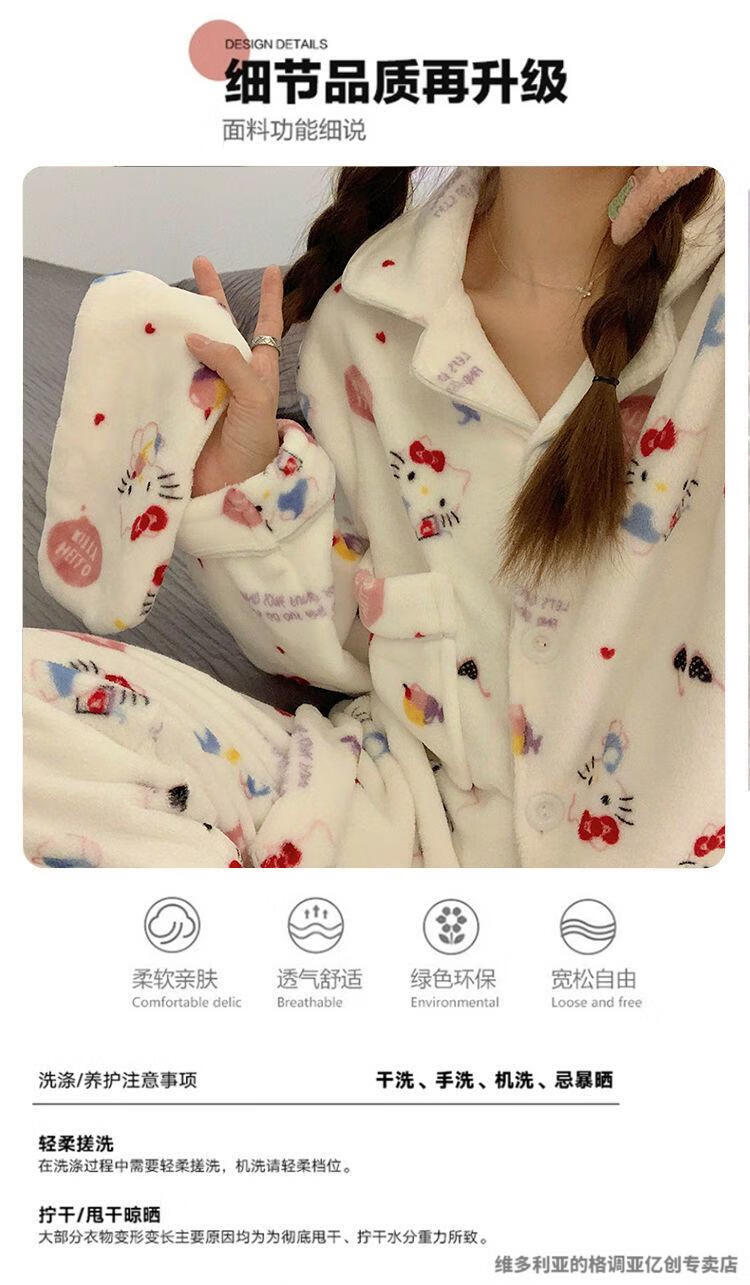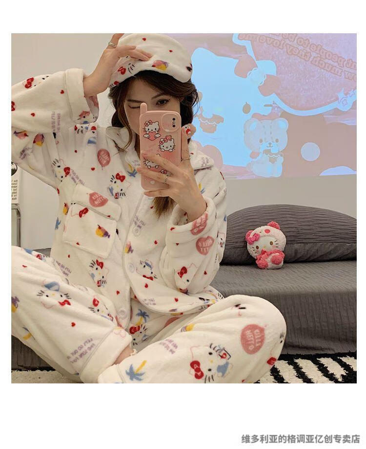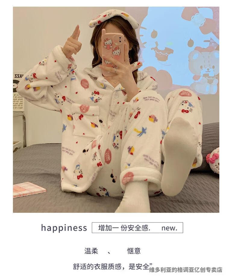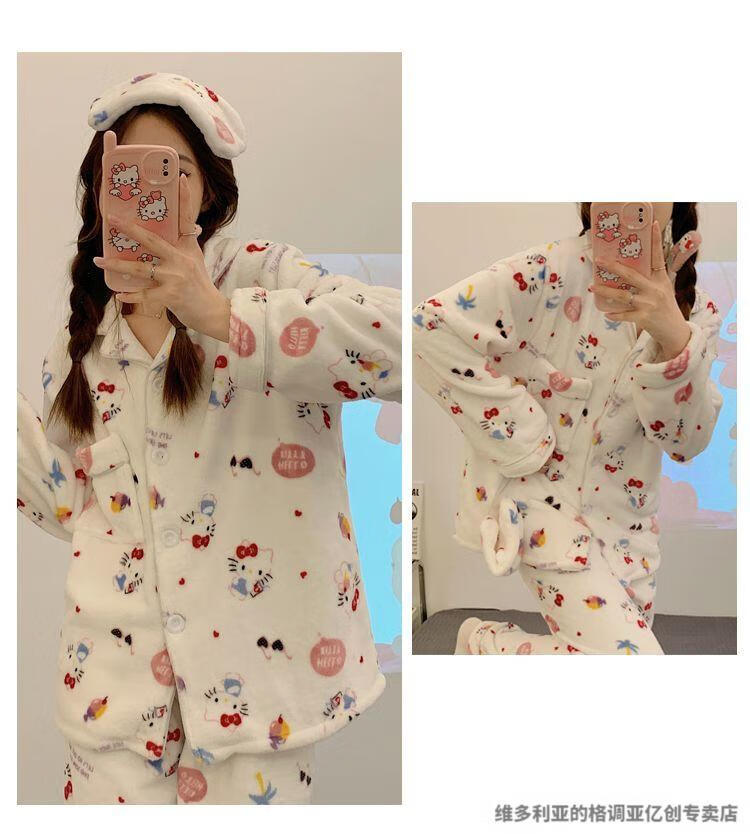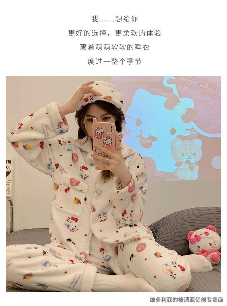 维多利亚的格调加绒加厚秋冬季睡衣女法兰绒珊瑚绒卡通猫咪学生家居服套装可外穿 绒-凯蒂猫 【无眼罩】 L 【95-115】