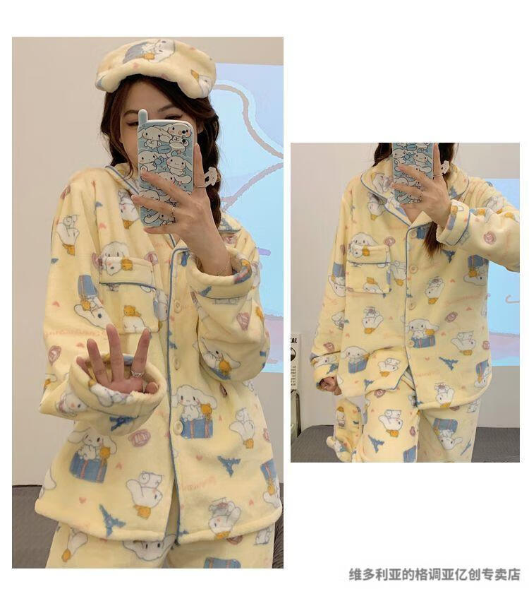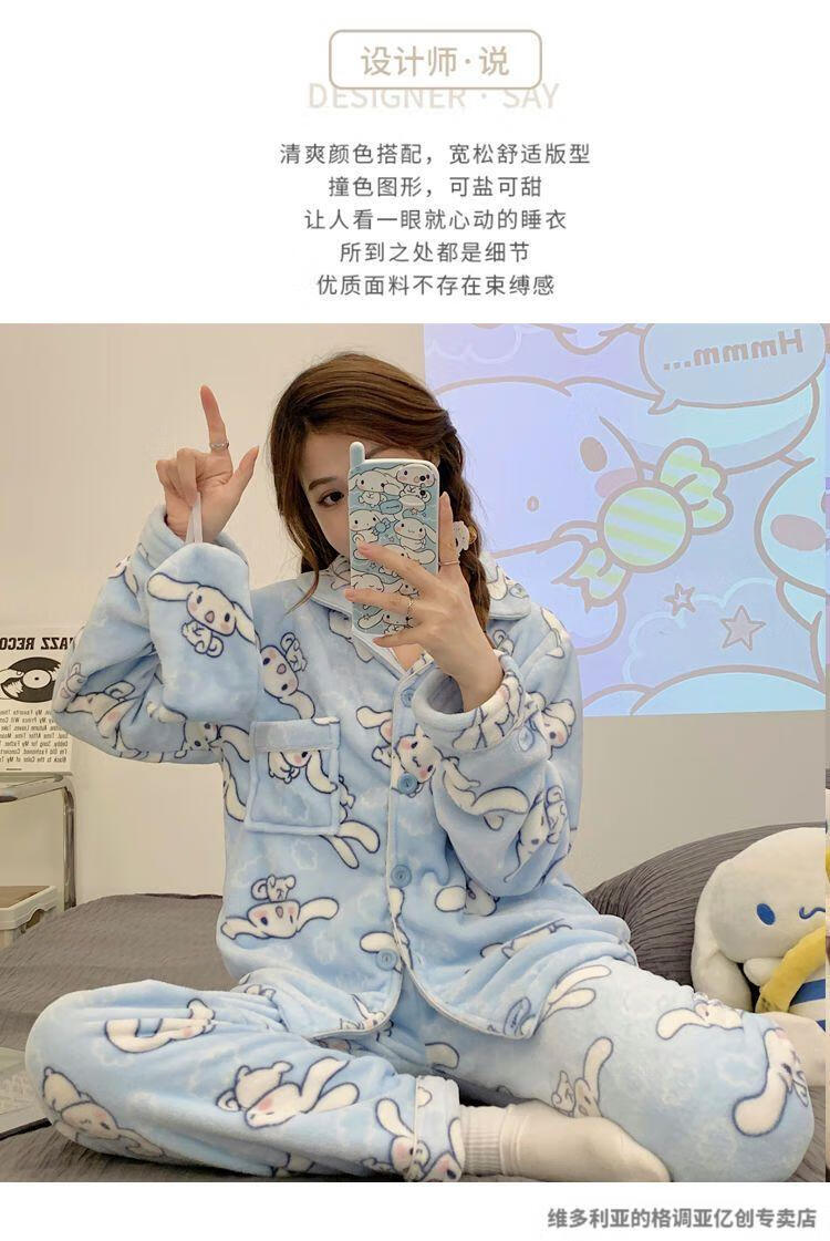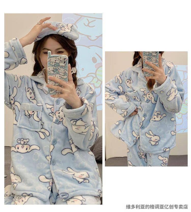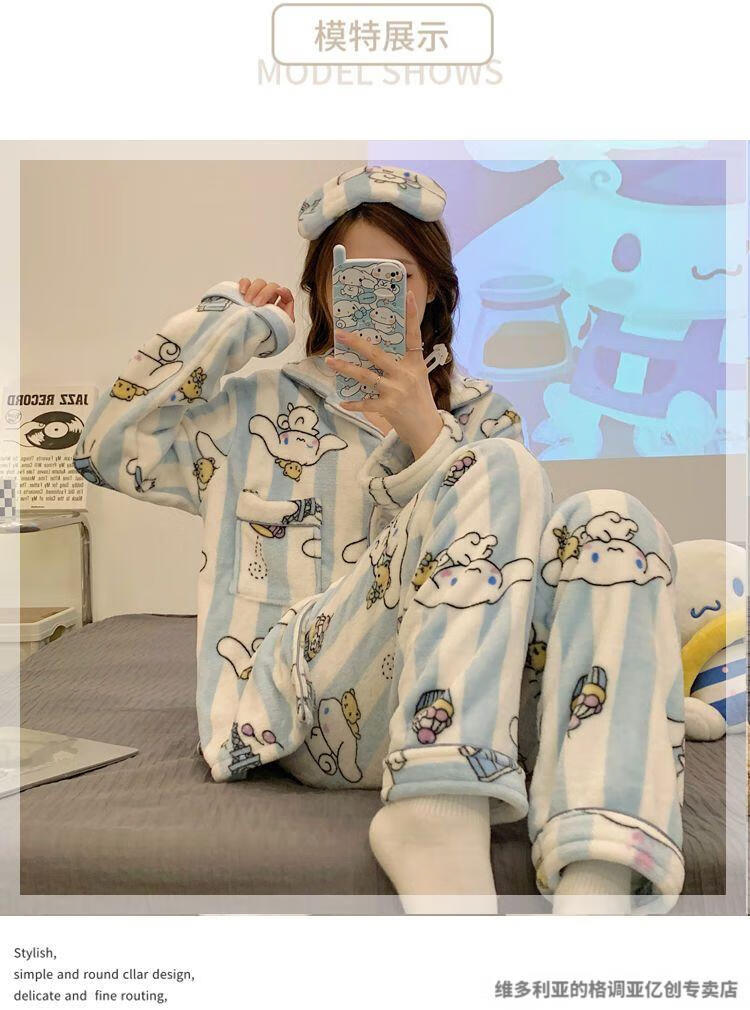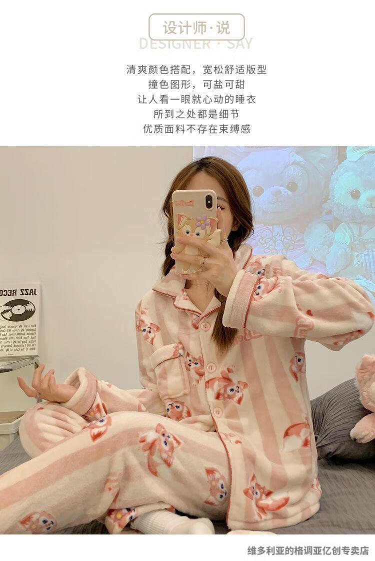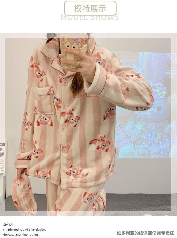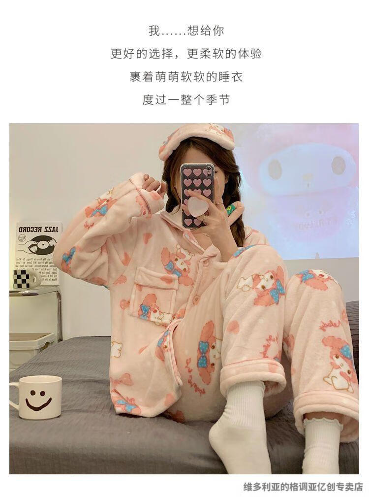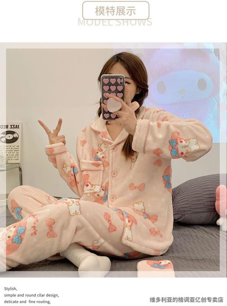维多利亚的格调加绒加厚秋冬季睡衣女法兰绒珊瑚绒卡通猫咪学生家居服套装可外穿 绒-凯蒂猫 【无眼罩】 L 【95-115】