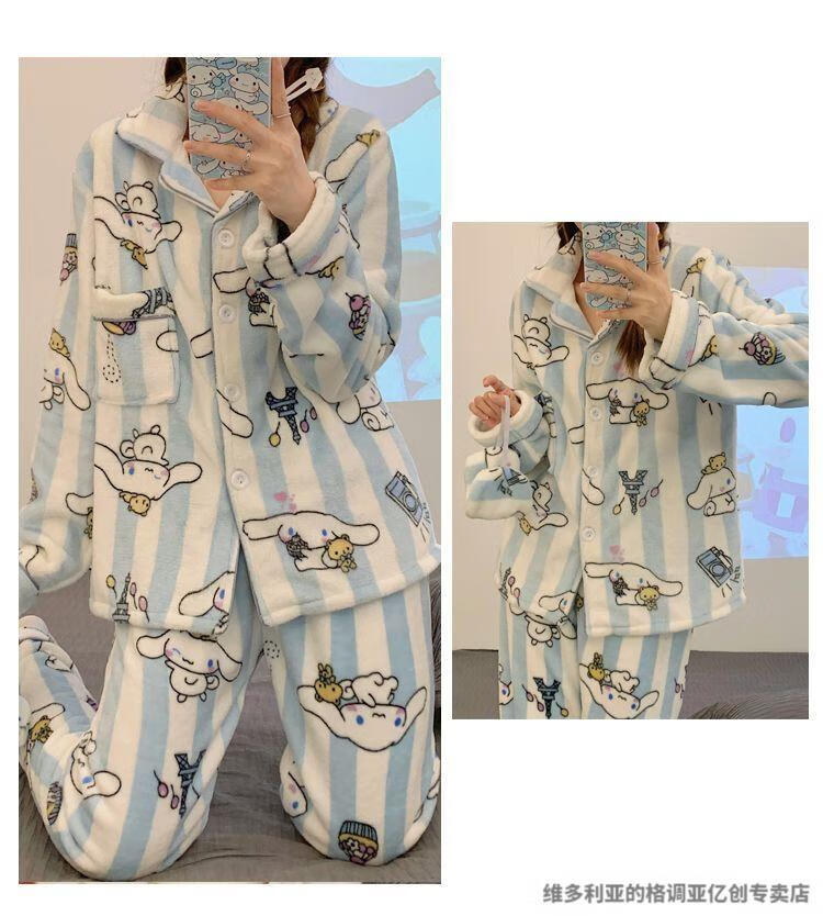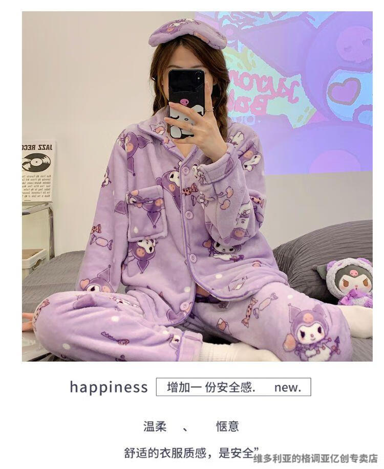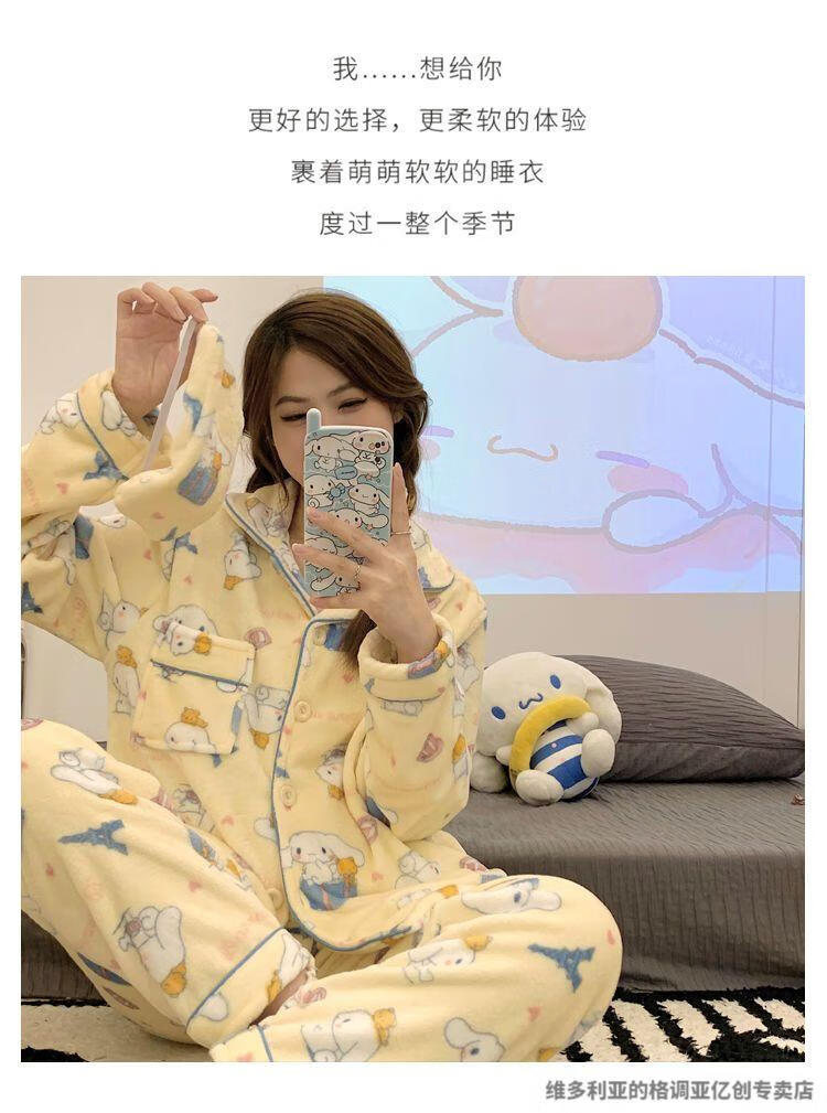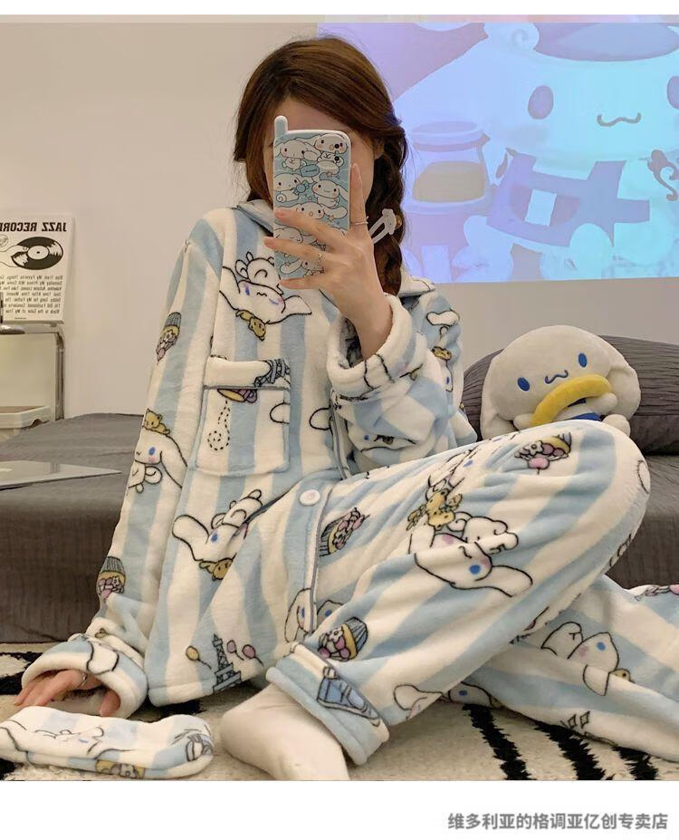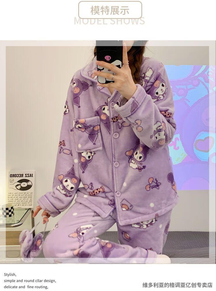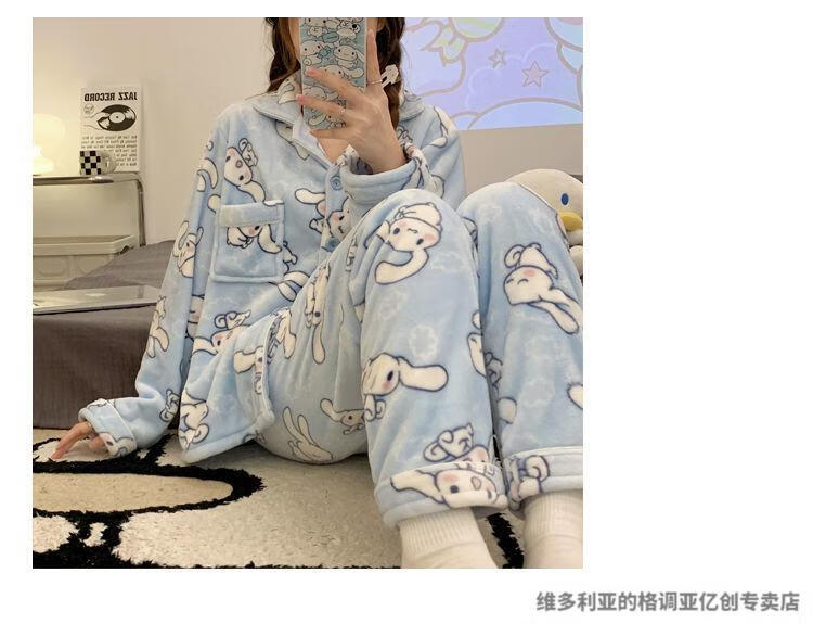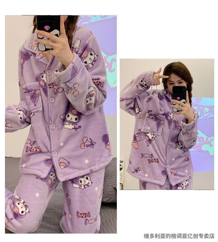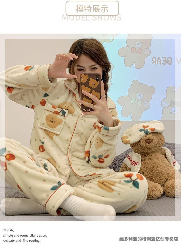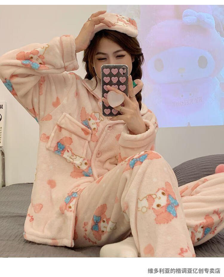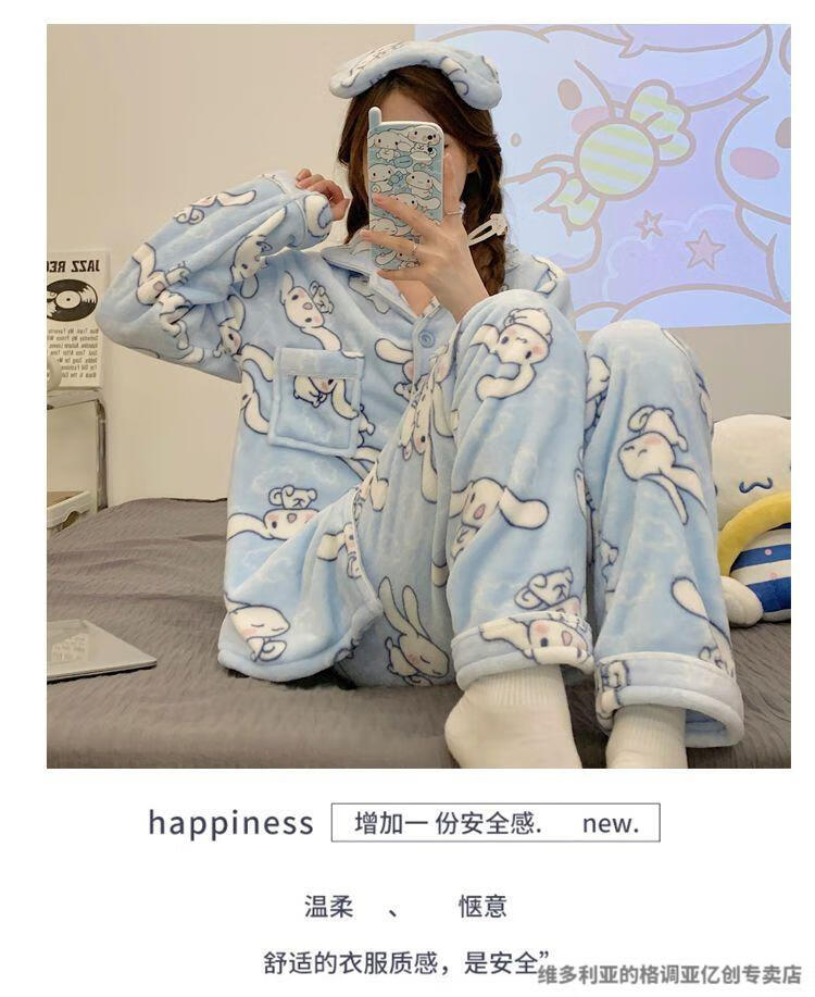 维多利亚的格调加绒加厚秋冬季睡衣女法兰绒珊瑚绒卡通猫咪学生家居服套装可外穿 绒-凯蒂猫 【无眼罩】 L 【95-115】