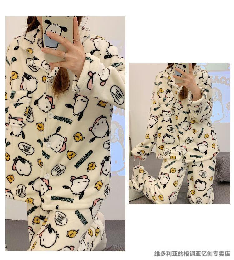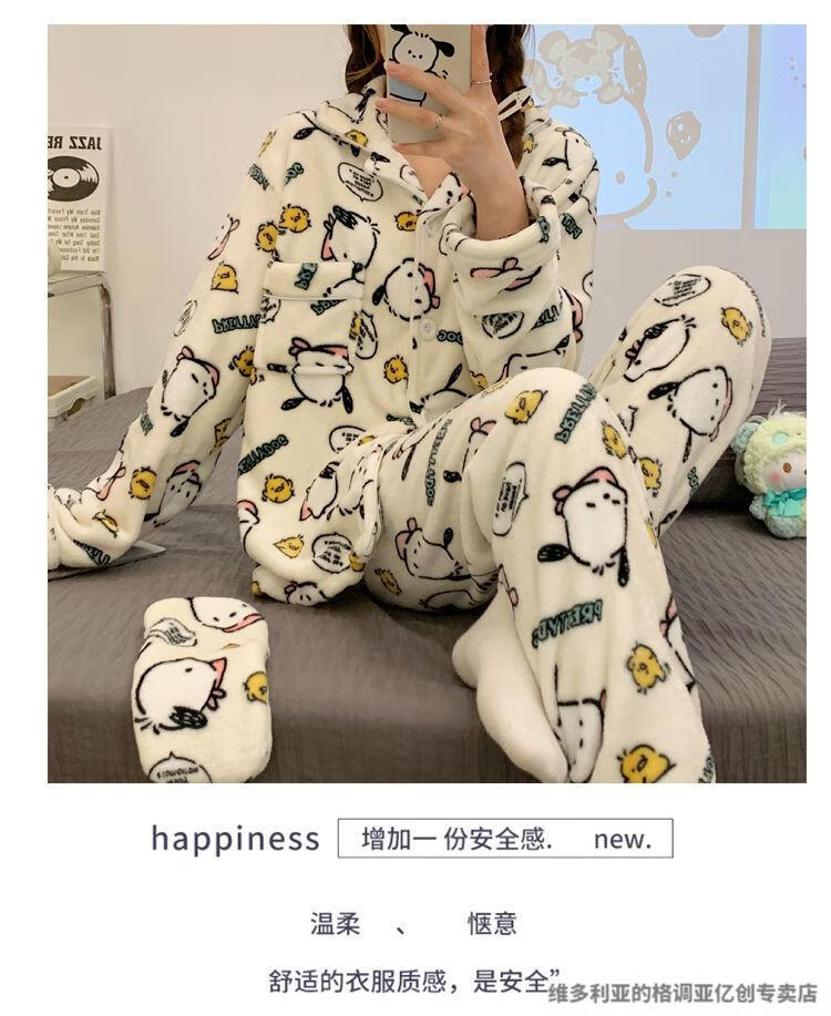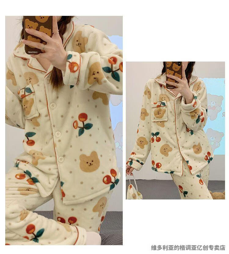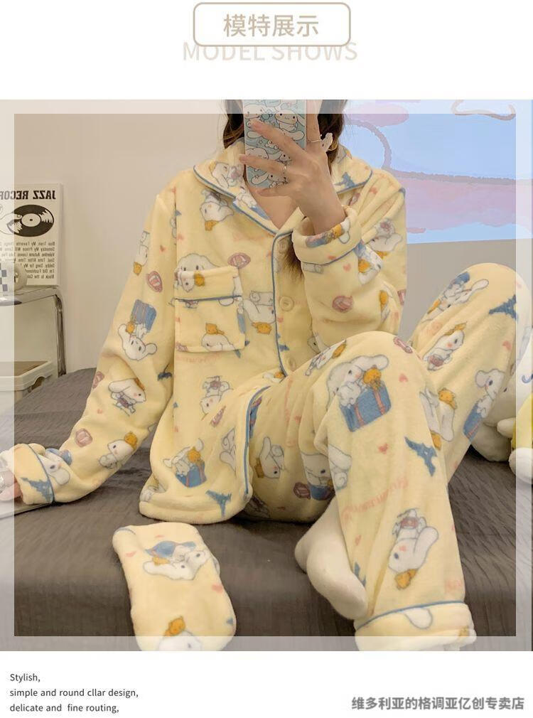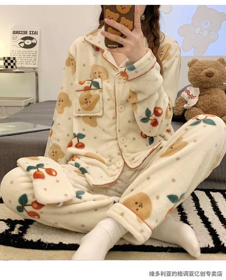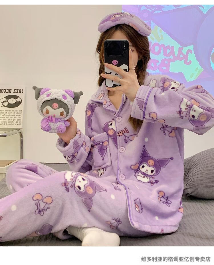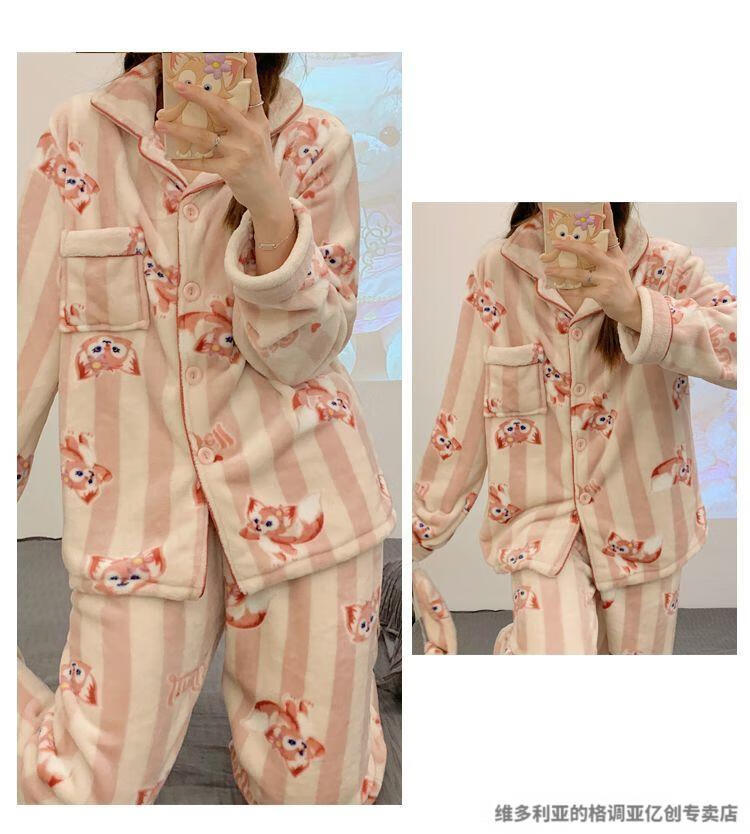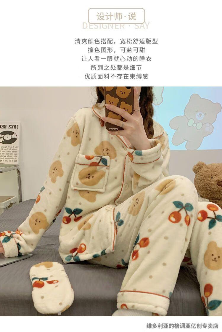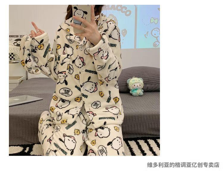 维多利亚的格调加绒加厚秋冬季睡衣女法兰绒珊瑚绒卡通猫咪学生家居服套装可外穿 绒-凯蒂猫 【无眼罩】 L 【95-115】