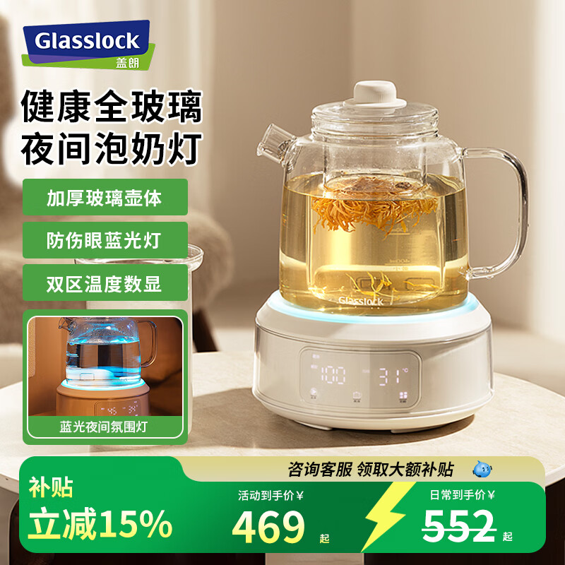 GLASSLOCK养生壶家用多功能煮茶器小型办公室玻璃烧水壶花茶壶 玻璃茶漏款【夜间氛围灯】 1.5L