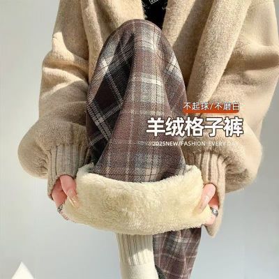 复古格子阔腿阔腿裤裤女羊羔绒秋冬新款加绒2025加厚慵懒棉裤保暖