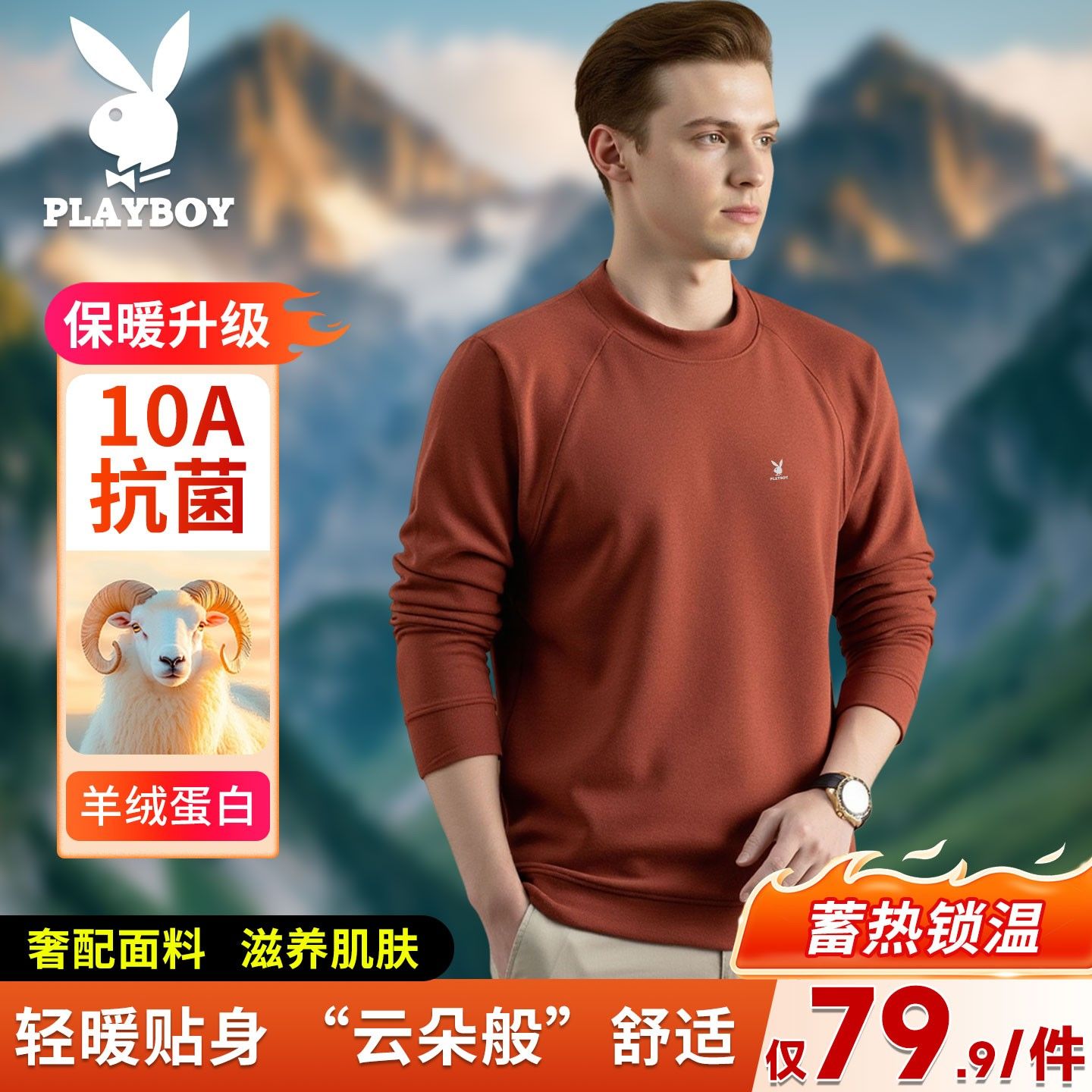 【羊绒蛋白纤维+10A抗菌+抗起球】花花公子秋男长袖圆领卫衣打底