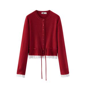 森马撞色蕾丝收腰短款针织开衫女