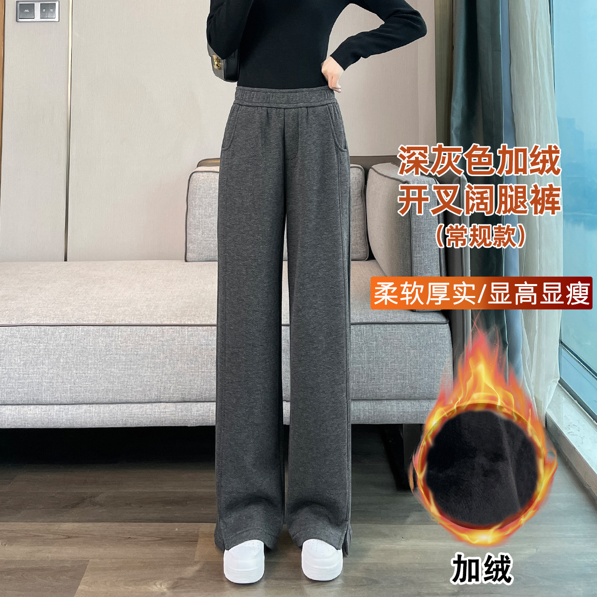 五只白鹅 【加绒可选】高级人字纹冬阔腿裤女小个子新年百搭毛呢开叉窄版裤
