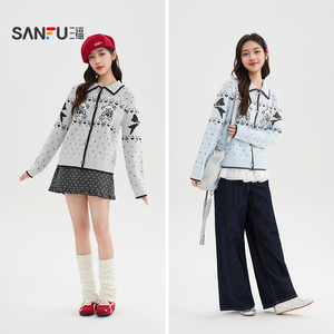 三福毛衣开衫女2025新款冬季小熊图案翻领宽松波点上衣女装513493